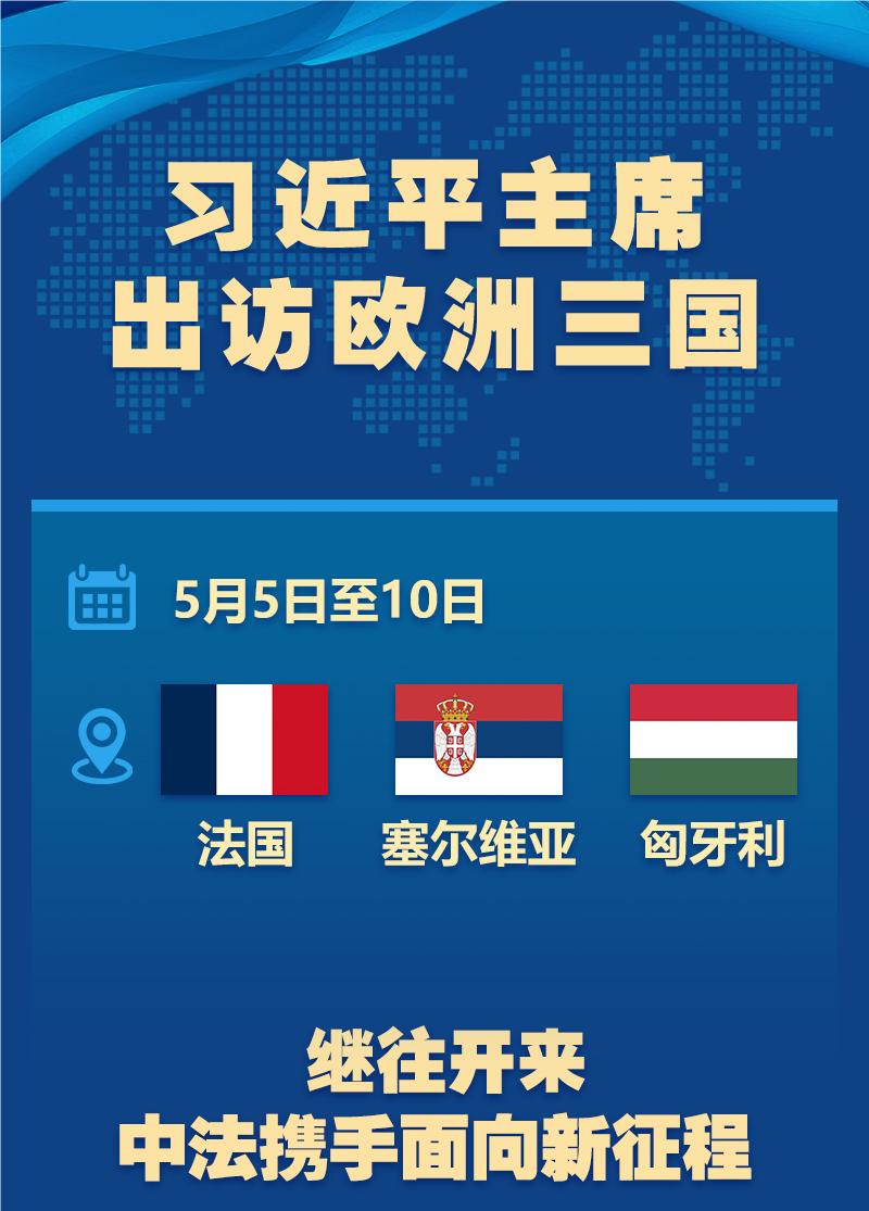 ??應法蘭西共和國總統馬克龍、塞爾維亞共和國總統武契奇、匈牙利總統舒尤克和總理歐爾班邀請,國家主席習近平將于5月5日至10日對上述三國進行國事訪問。