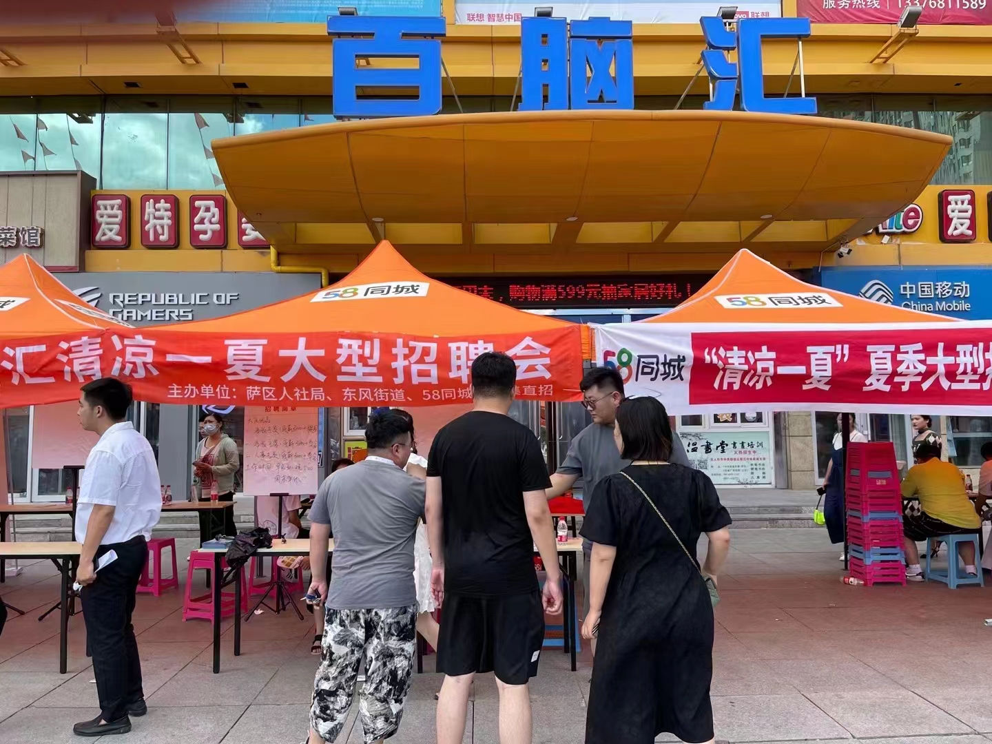 7月10日上午,新村萬(wàn)達(dá)休閑廣場(chǎng)人流如潮。大慶市人社局和五八同城聯(lián)合舉辦的“清涼一夏”大型招聘會(huì)萬(wàn)達(dá)專場(chǎng)如火如荼進(jìn)行。